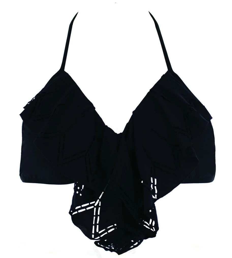 L*Space Aliza Flutter Top in Black offer laser cut detailing on the ruffles.Top ties at the back and neck.