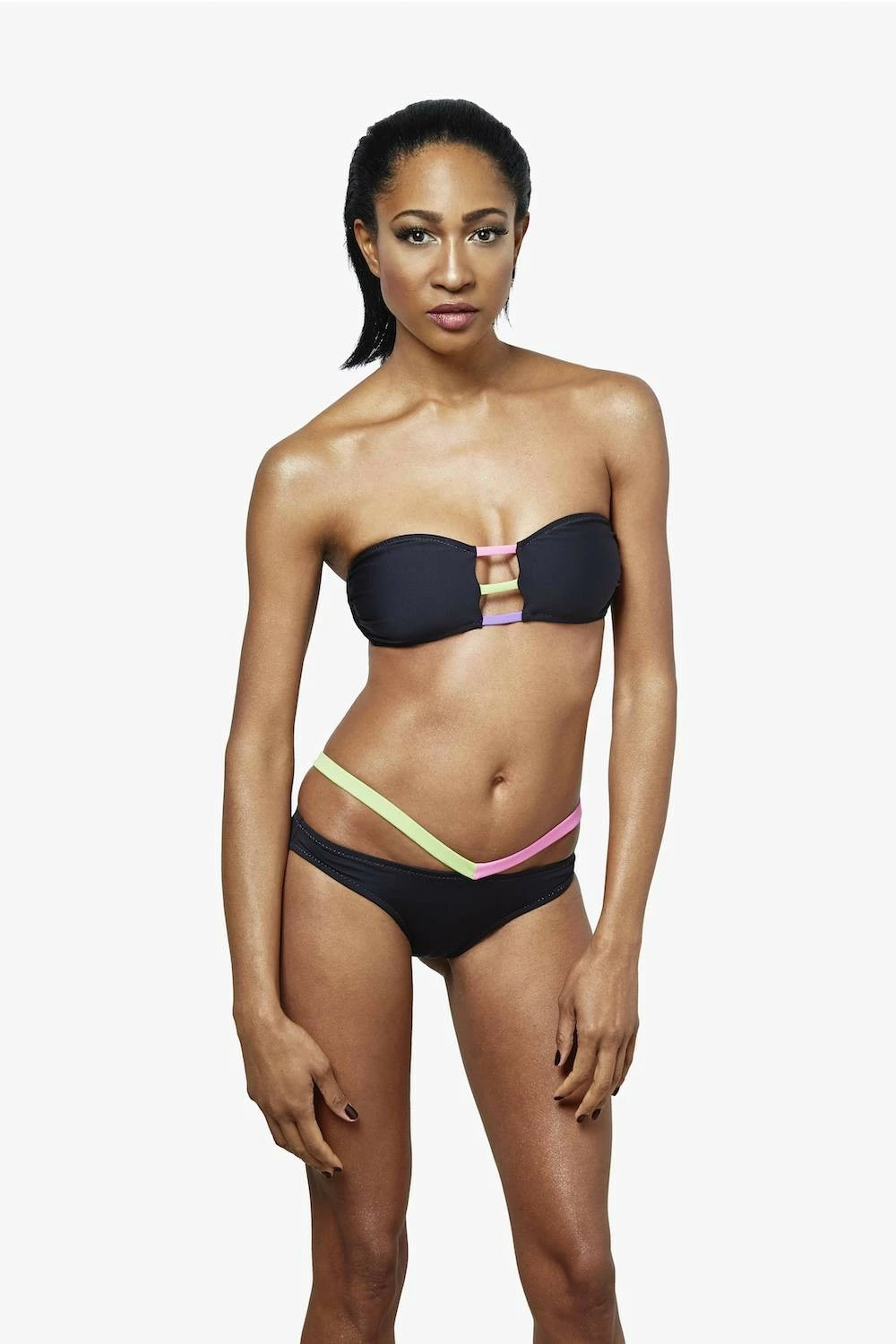 Mon Cheri Bikinis Chloe Strappy Bikini Bottom in Color Black. Strappy Bottom with Brazilian Coverage.