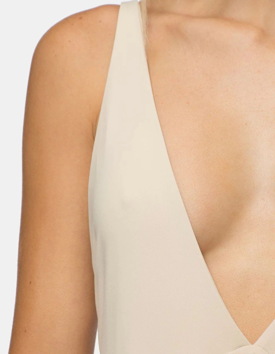 Drew One Piece in Tapioca by Tavik Swimwear.A plunging v neck line one piece with adjustable over the shoulder back straps. This Drew is the perfect One Piece that can also be wore as a body suit.