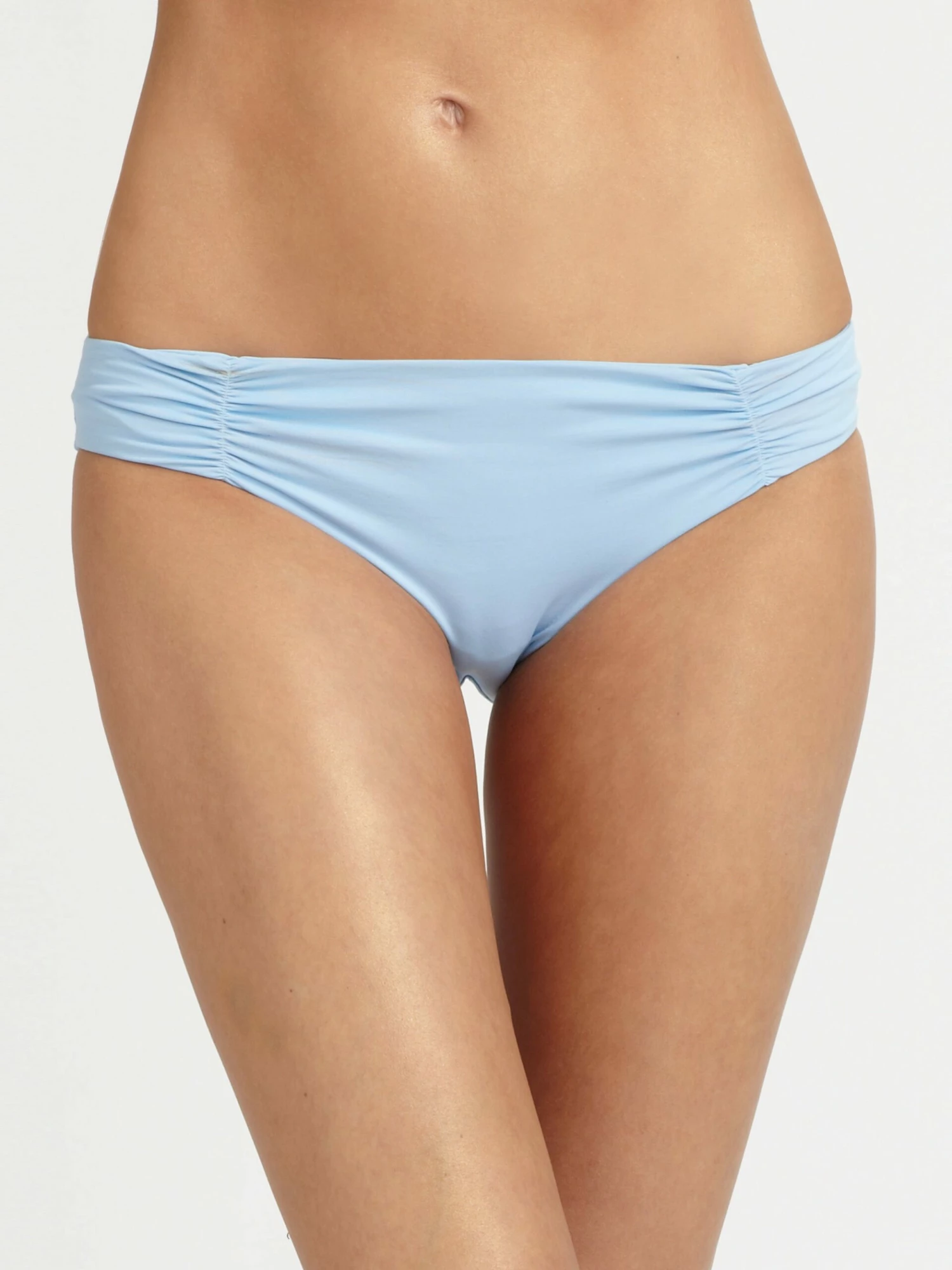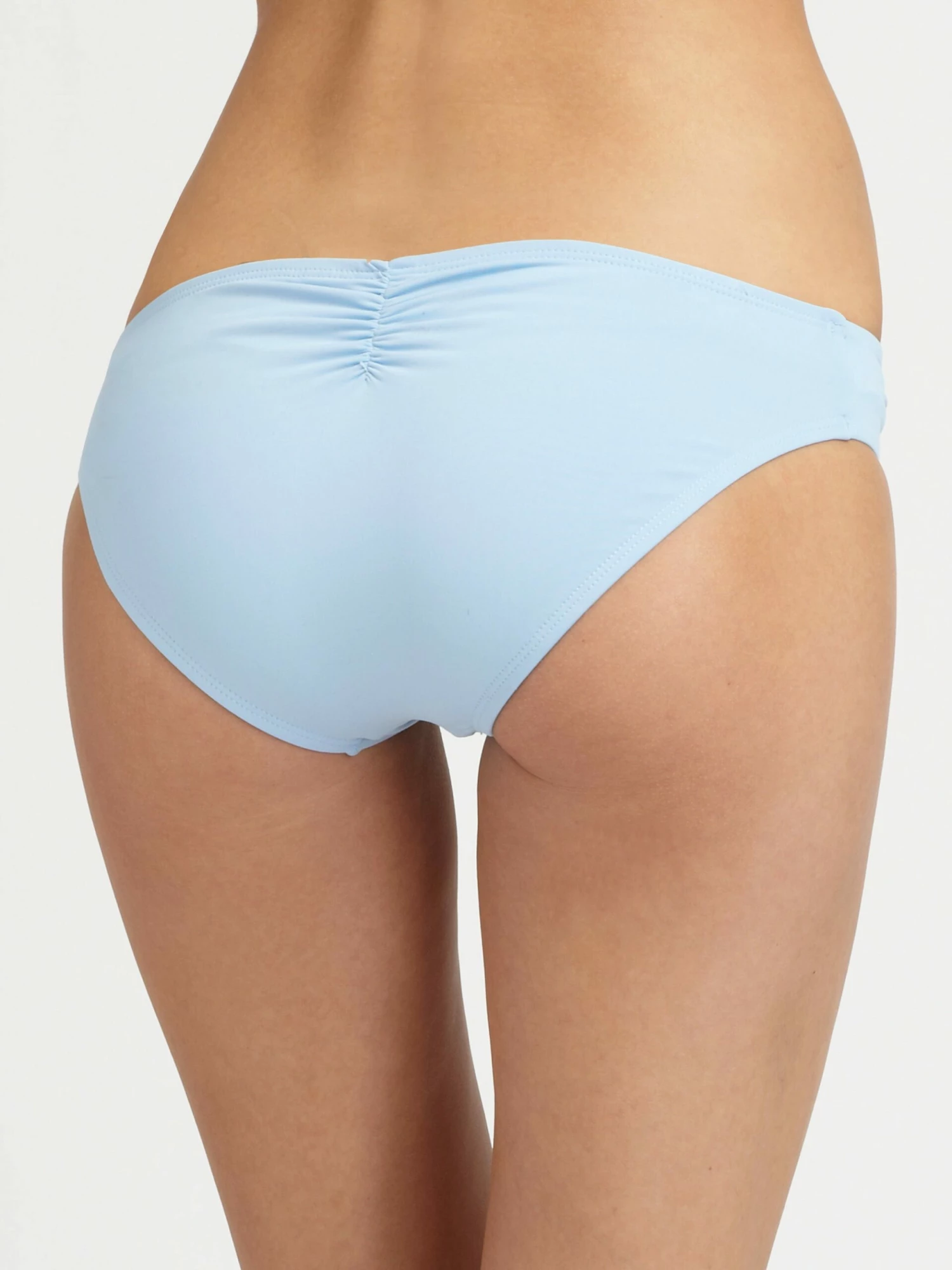 L*Space Monique Bikini Bottom in Powder Blue. Seamless construction solid bottom sits low on hips. Small rouching in back and on front sides. Full back coverage.