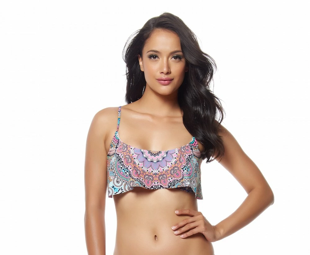 Montezuma Flounce Cross Back Top in Cream by Red Carter. Slip on flounce top features adjustable straps that criss cross at the back.