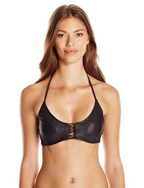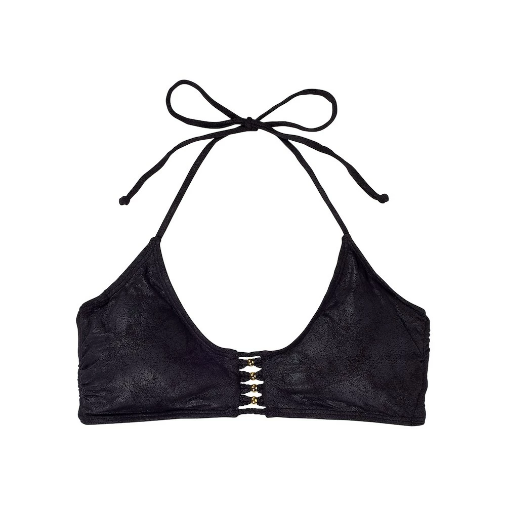 PilyQ Onyx Braided Zen Halter Bikini Top in Black. Braided Zen Bikini Top Pull over style bikini top offer underwire under the bust and has soft pads to provides more support at bust gold beaded details and multi braided strap detailing at center front and back give sexy look to this top.